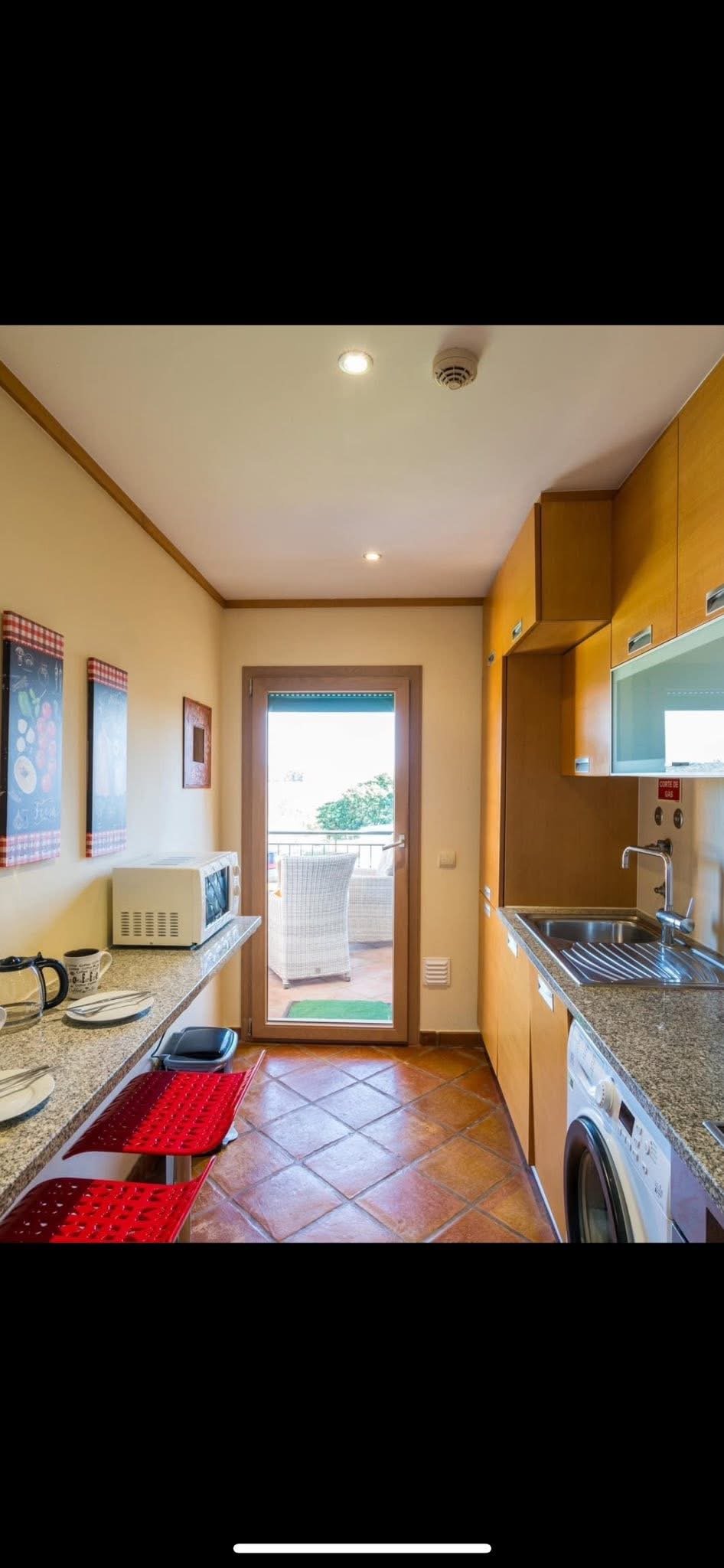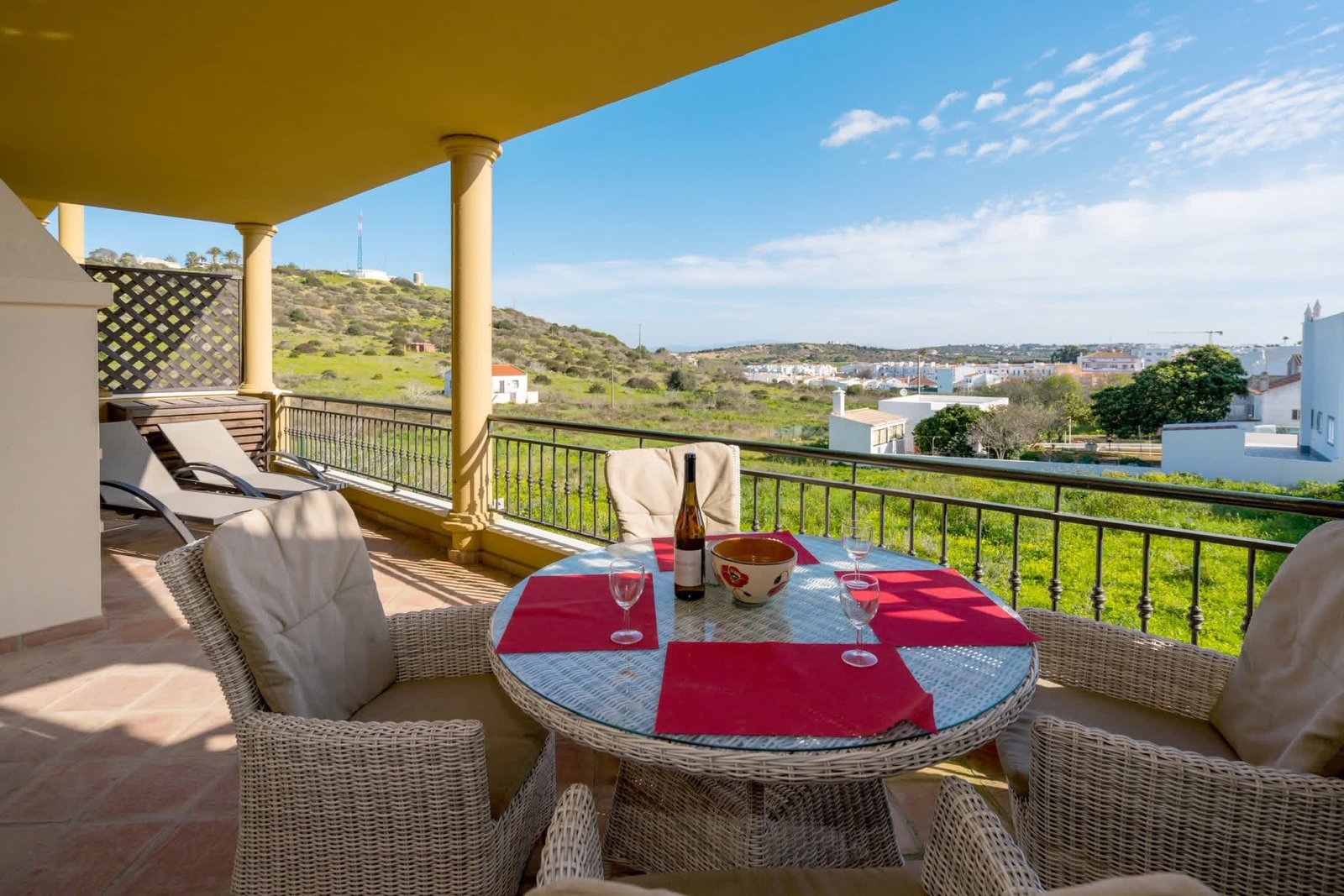 Very large balcony overlooking the village with built in BBQ, free access to pool and gardens overlooking the sea.