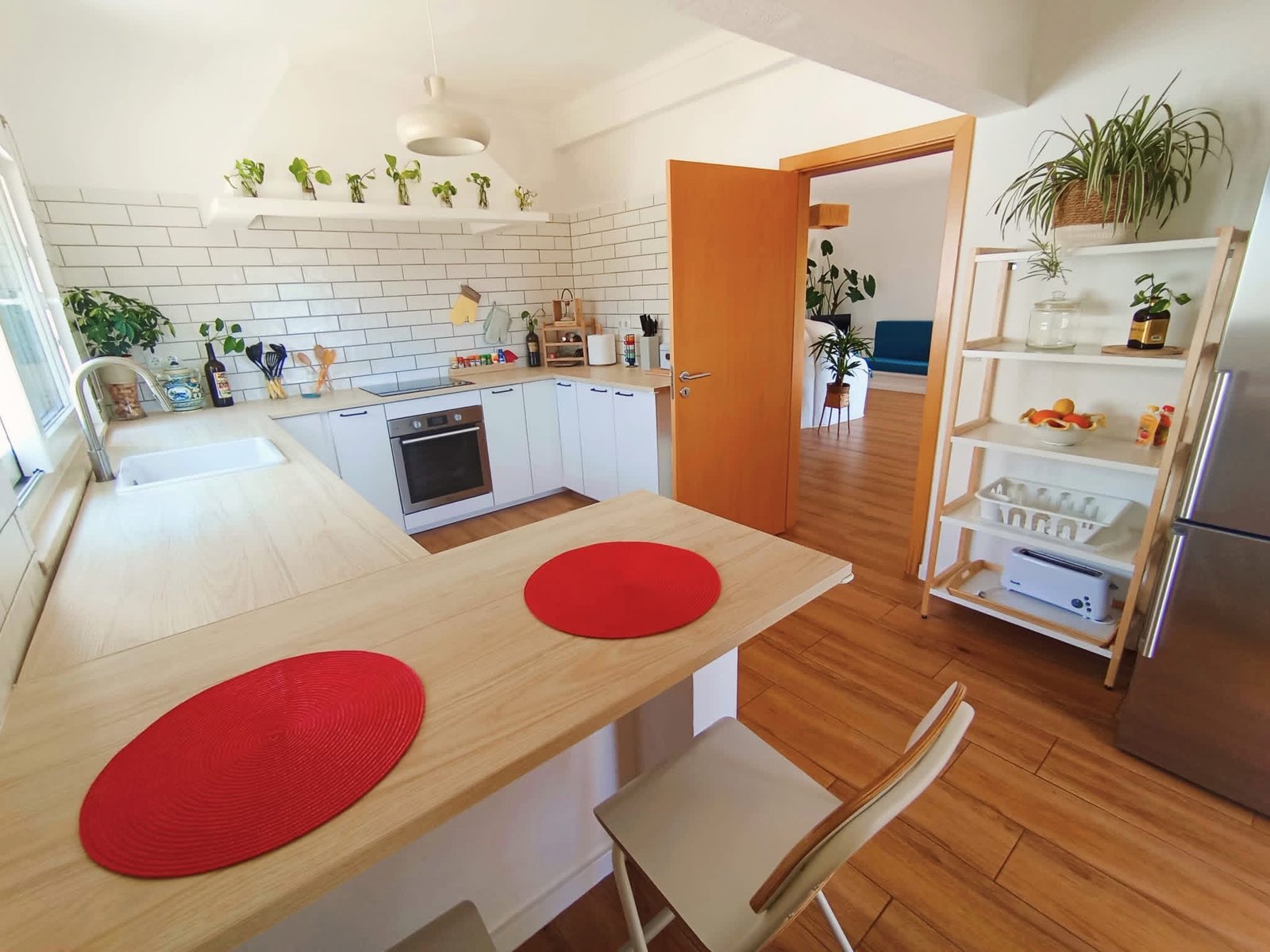 The kitchen caters to cooks of all appetites, equipped with oven, hob, fridge, dishwasher, coffee maker, and a dining table—perfect for both quick breakfasts and leisurely dinners.